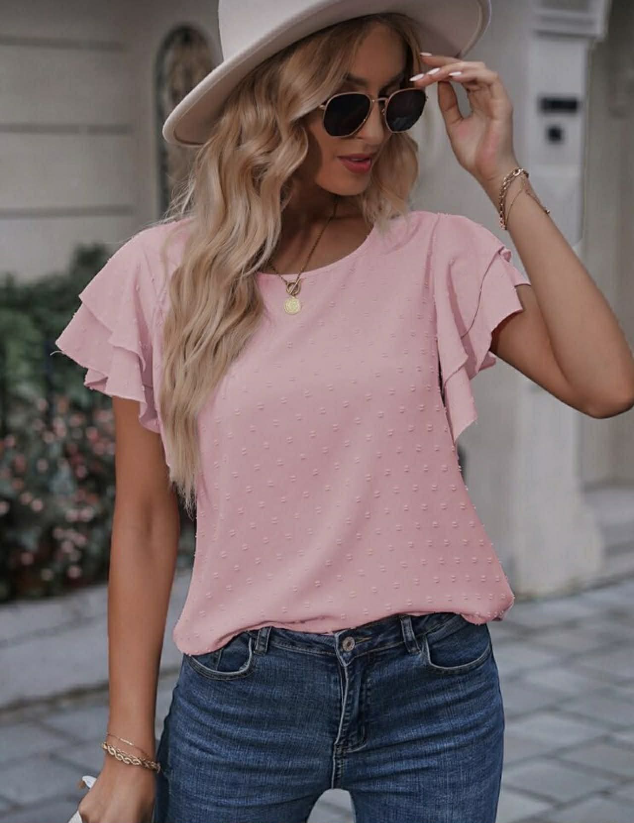 Ruffled detailing along the sleeves is so cute and that light Swiss dot fabric is super trendy