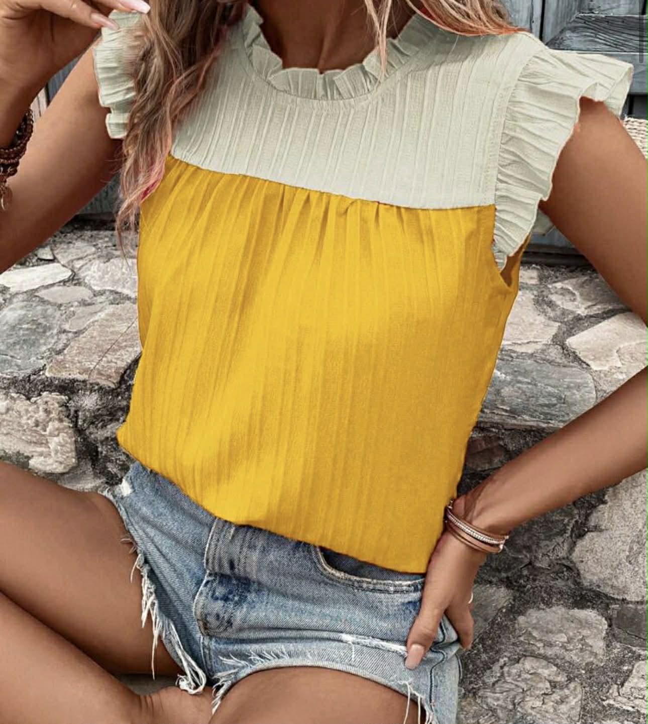 Yellow/Off white crinkled blouse is attractive with ruffles and flutter sleeve